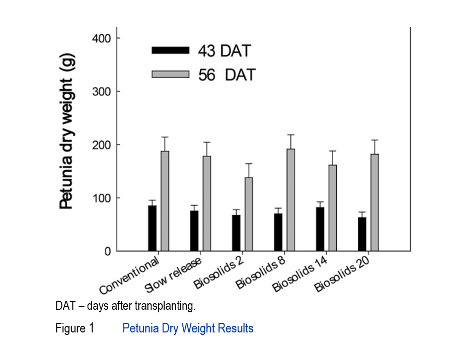 Additionally, plant shoot dry mass was measured. Except for Swiss chard, no differences in dry weight were observed for dianthus, kale, or petunia in comparison to the conventional and slow-release fertilizers, which suggests that farmers would likely be able to achieve comparable yields from biosolids as they would from fertilizers. Figure 1 shows the dry weight accumulation results for petunia. Swiss chard had a reduction in dry weight for all biosolids application rates compared to the conventional and slow-release fertilizer controls.